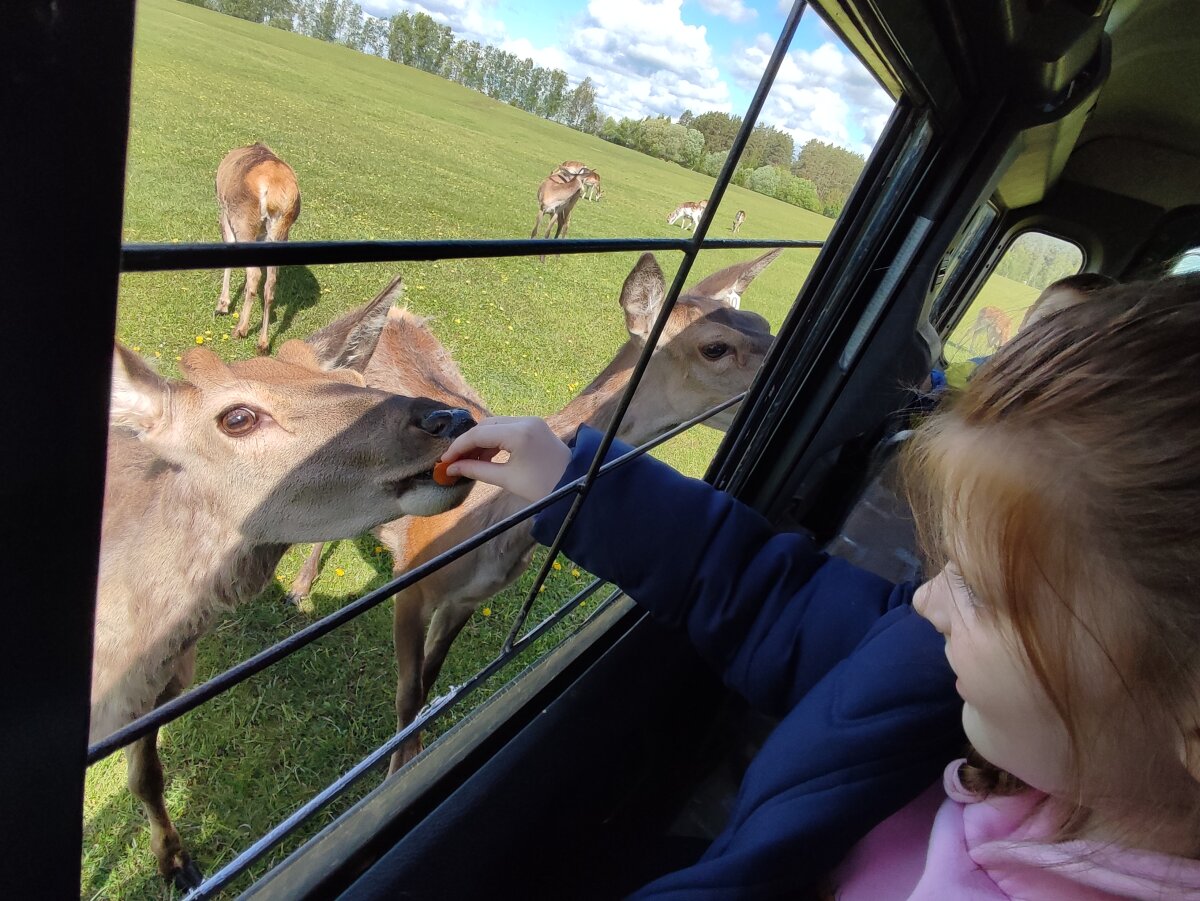 Pirmiausia aplankėme Anykščių safario parką. Vaikų akys tiesiog švytėjo pamačius įvairiausius gyvūnus. Ar žinojote, kad ten galima pamatyti ne tik Lietuvoje gyvenančius gyvūnus elnius ir danielius, bet ir egzotiškesnius gyvūnus, lamas ir zebrus? Mažieji tyrinėtojai su dideliu susidomėjimu stebėjo jų elgesį, vaišino specialiu maistu. Buvo daug juoko ir nuostabos! Po įspūdžių safari parke mūsų laukė dar viena pramoga - batutų parkas. Oho, kiek ten buvo krykštavimų ir džiaugsmo! Vaikai įveikė įvairiausius kliūčių ruožus.