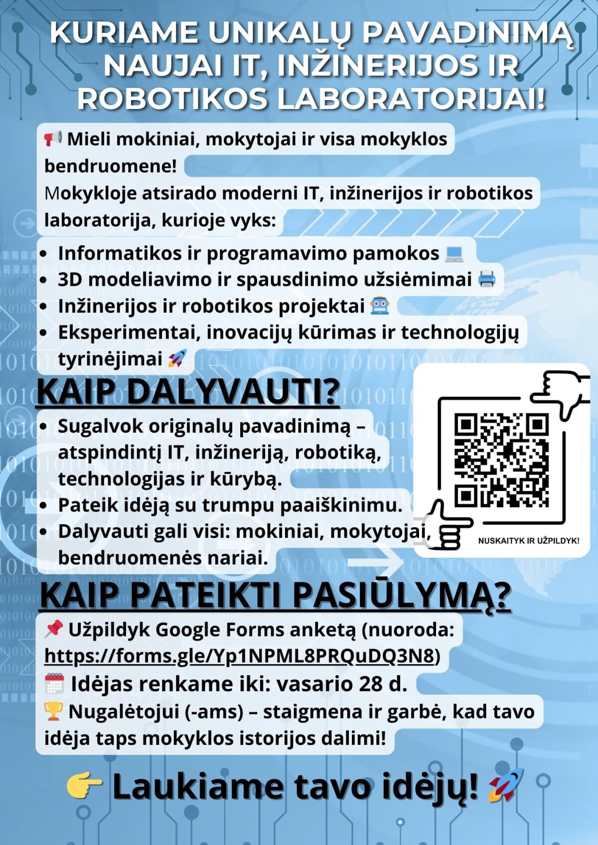 Prisidėk prie naujos laboratorijos kūrimo ir palik savo pėdsaką mokyklos bendruomenėje!
