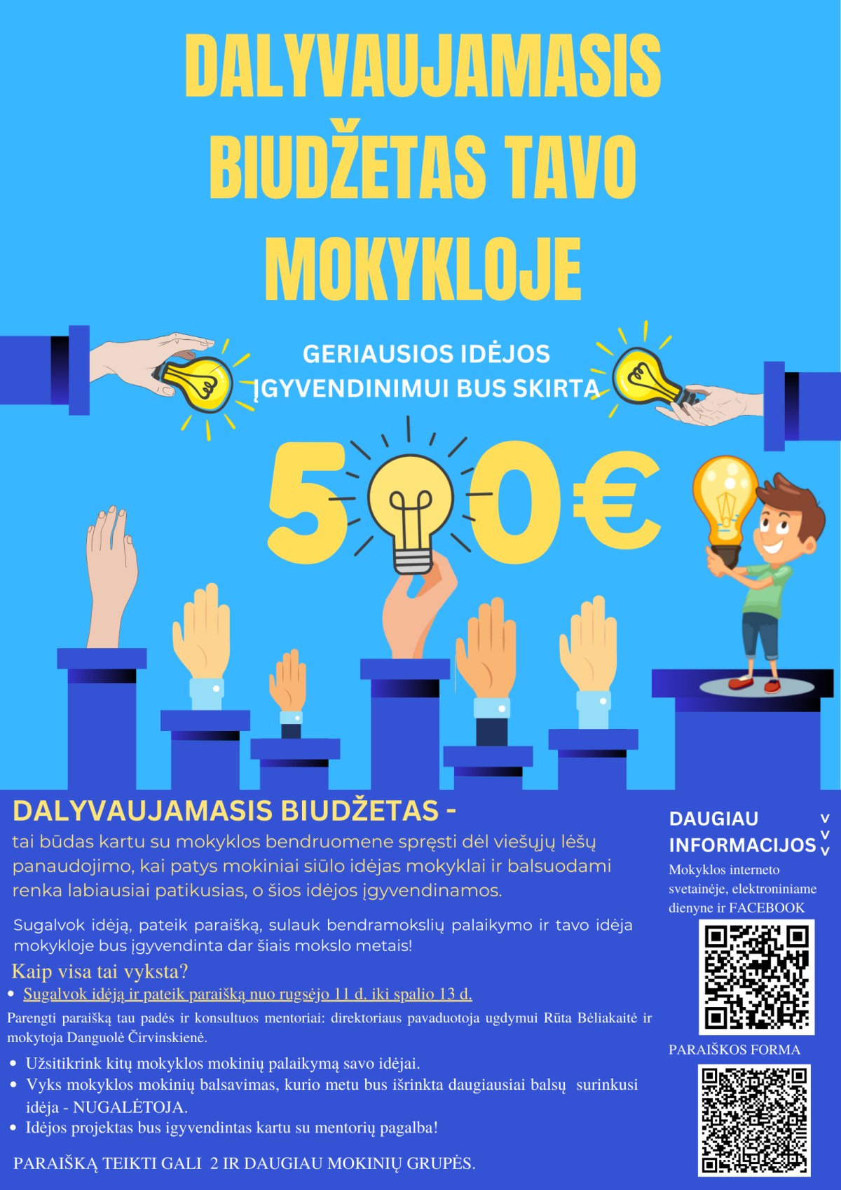 Kviečiame visus mokyklos mokinius burtis į grupes (2-5 asmenys) ir teikti savo idėjas dalyvaujamojo biudžeto iniciatyvai .