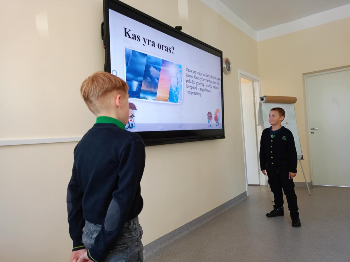 1c klasės mokiniai Arijus Gatautis ir Bernardas Armonas pristatė tiriamąjį darbą apie orą, kaip žinių vedėjai sužino koks bus visos savaitės oras ?