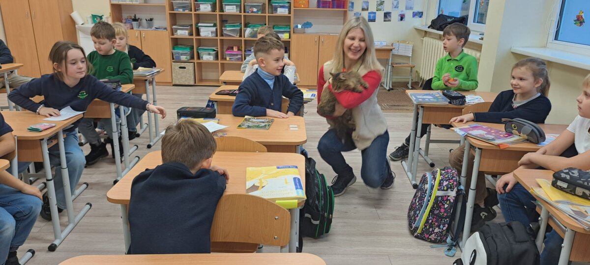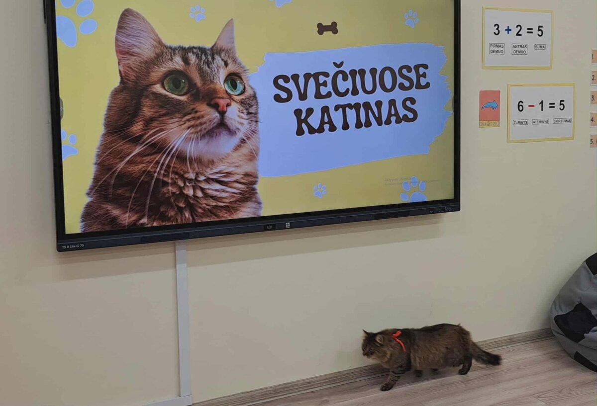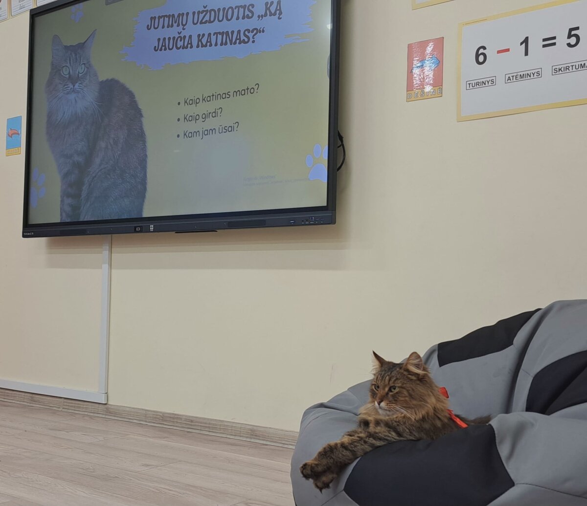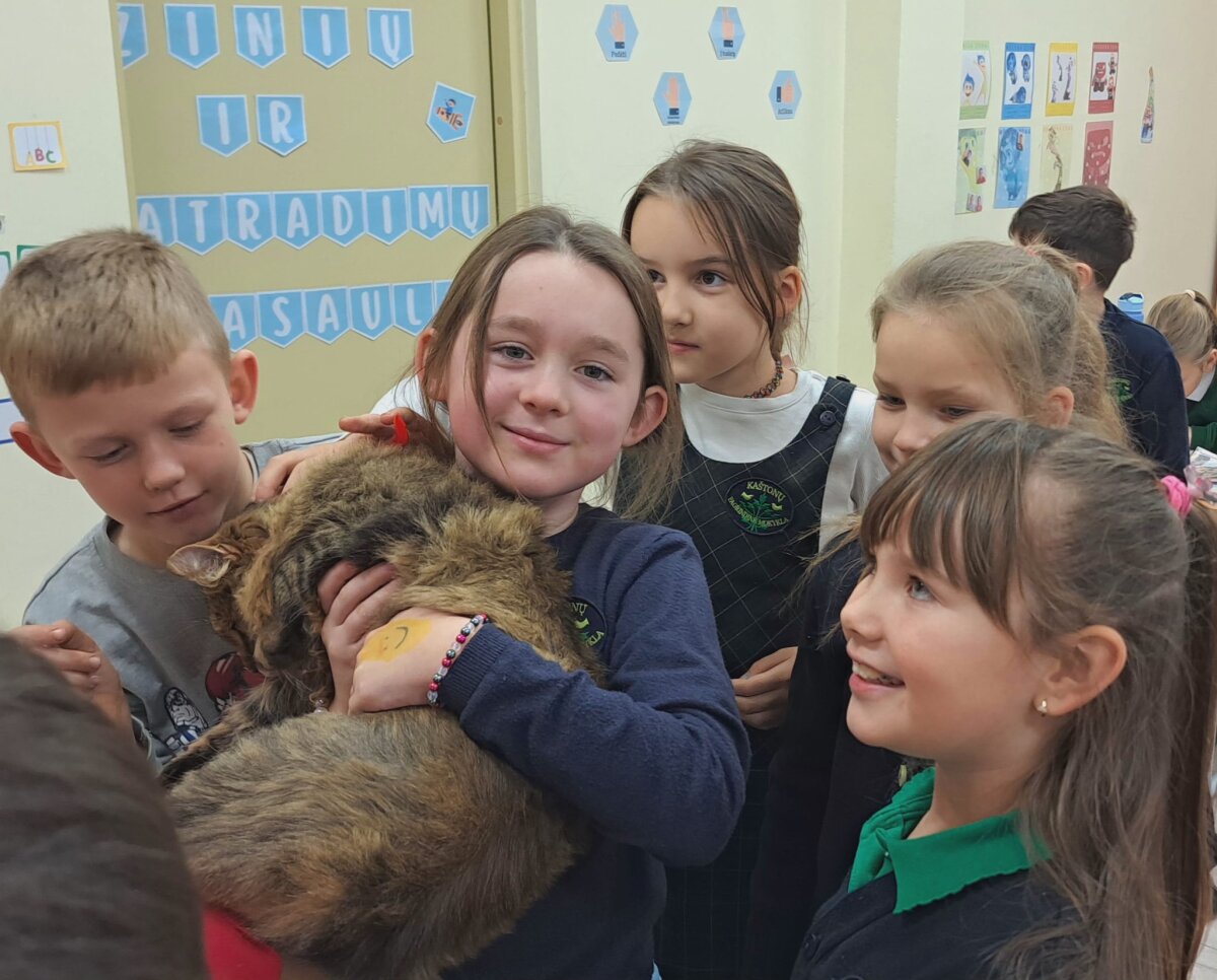 Susipažinkite – tai Mažylis, švelnus ir draugiškas katinas, kuris kantriai leidosi glostomas, tyrinėjamas ir, atrodo, pats džiaugėsi vaikų dėmesiu. Vaikai turėjo galimybę iš arti stebėti gyvūną, dalinosi savo pastebėjimais, uždavė daugybę klausimų, atliko užduotis ir sužinojo daug įdomių faktų apie augintinius. Pamoka virto jaukia, šilta bendravimo ir pažinimo valandėle, kupina smalsumo, džiaugsmo ir empatijos.