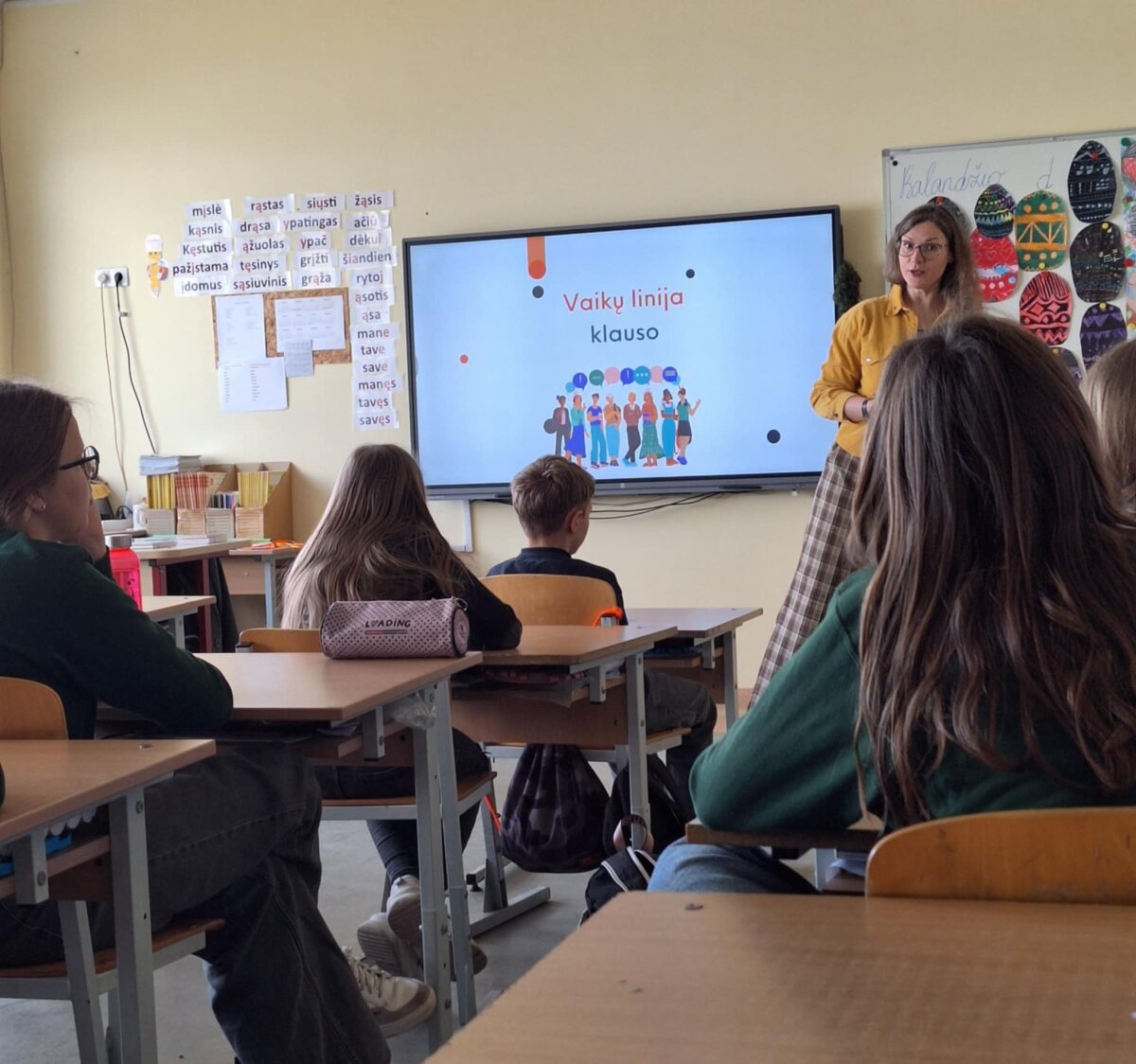 Balandžio 28 dieną mūsų mokykloje lankėsi Vaikų linijos kampanijos BE PATYČIŲ koordinatorė Eglė Tamulionytė, kuri ketvirtokams ir daliai penktokų pristatė nuo 1997 metų Lietuvoje veikiančią nevyriausybinę Vaikų linijos organizaciją. Ši vaikų ir paauglių emocinės paramos tarnyba nuo 11-23 val. telefonu (nr.116 111) bei nuo 14-23 val. internetu teikia nemokamą ir anonimišką pagalbą. Buvo paminėta, kad 2024 metais savanoriai su vaikais susirašinėjo žinutėmis internetu – 7475 val., o  telefonu su vaikais kalbėjosi – 6182 val. Vaikai diskutavo, kas paskatina savanorius teikti emocinę pagalbą neatlygintinai ir kurti ryšį su kitu žmogumi saugioje ir jaukioje aplinkoje, skatinančioje džiaugtis, liūdėti, pykti ir tiesiog jausti. Lektorė akcentavo, kad Vaikų linija yra patikima, lengvai pasiekiama organizacija, su kurios konsultantais vaikai gali kalbėtis apie jiems rūpimus dalykus (santykius su tėvais, draugais, savižudybę, baimę ir nerimą, patyčias, vienišumą, fizinę sveikatą, fizinę prievartą, savęs žalojimą ir pan.).