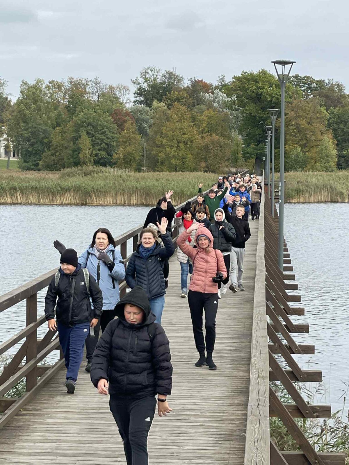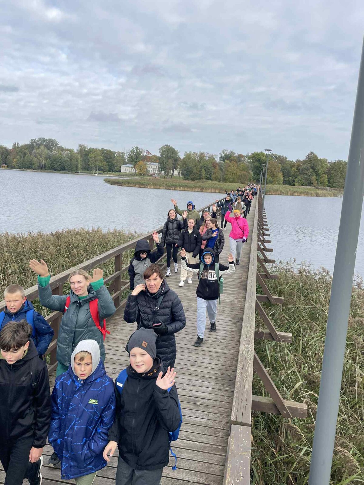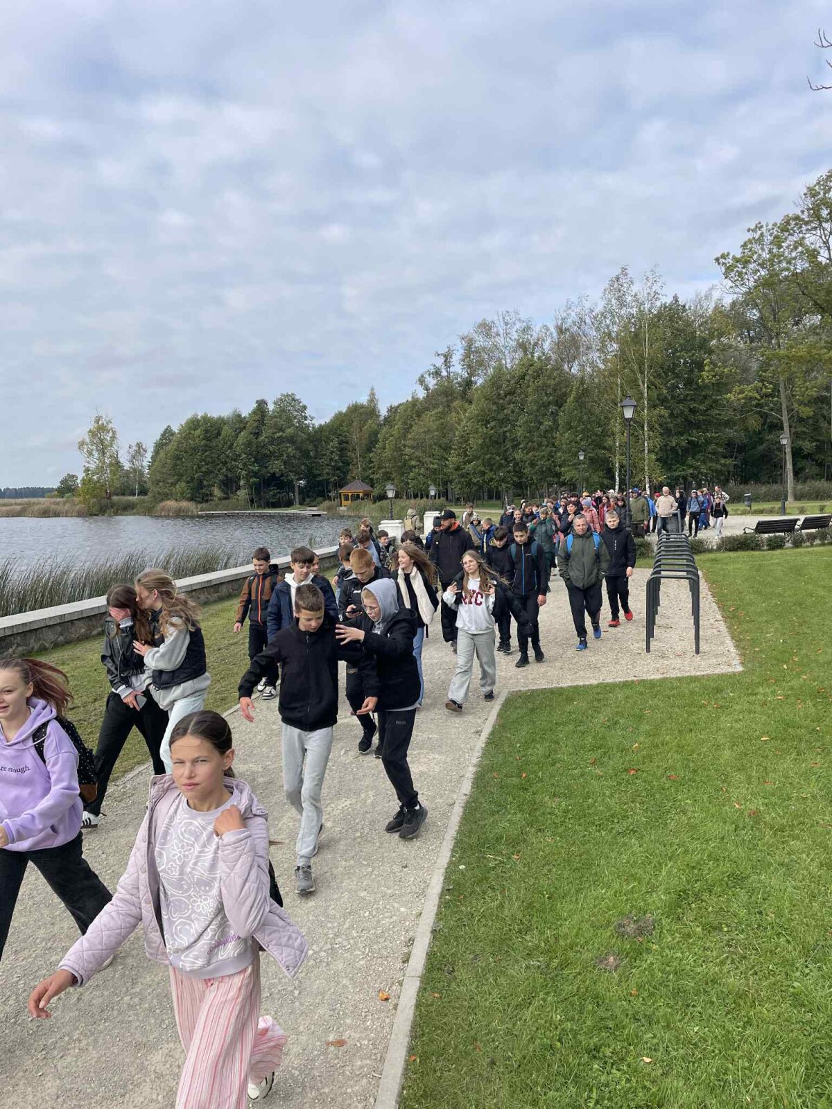 Mokyklos bendruomenę sukvietė rudeninis žygis " Misija Įmanoma'25". Po smagios mankštos, kurią vedė fizinio ugdymo mokytojas Egidijus Šnaras, pradinio ugdymo mokiniai su savo mokytojomis ir tėveliais patraukė trumpesniuoju maršrutu, kuris- lyg tyčia????- vedė pro žaidimų aikštelę.