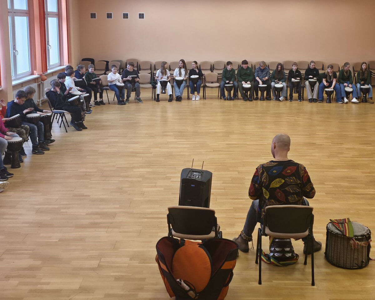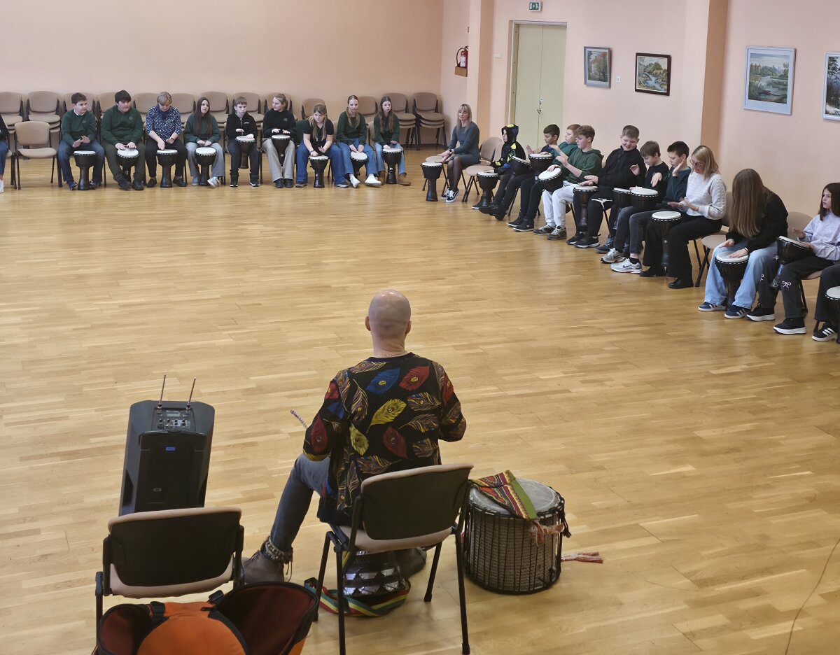 Lapkričio 24 dieną mokykla dundėjo - šeštokai, aštuntokai, devintokai ir dešimtokai dalyvavo edukacinėje Kultūros paso muzikos pamokoje ,,Afrikos būgnai'', kurią vedė profesionalus muzikantas ir būgnininkas Gediminas. Mokiniai sužinojo įdomybių apie būgnus, jų kilmę, varžėsi mini viktorinoje ir, žinoma, grojo. Kiekvienas turėjo galimybę paimti būgną į rankas ir išgauti tikrą afrikietišką ritmą. Ritmai užbūrė -dundėjimas aidėjo visoje mokykloje, o šypsenos nedingo net po pamokų! Tokios veiklos ne tik linksmina, bet ir skatina kūrybiškumą bei saviraišką.